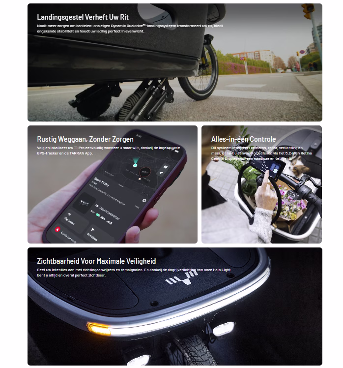 Met zijn robuuste bouw, sterke motor en ruime opslagcapaciteit is de Tarran T1 Pro een betrouwbare keuze voor iedereen die praktisch, veilig en comfortabel wil reizen. Of je nu kinderen vervoert of intensief gebruik maakt van een cargo bike: deze elektrische bakfiets levert prestaties die je dagelijks voe